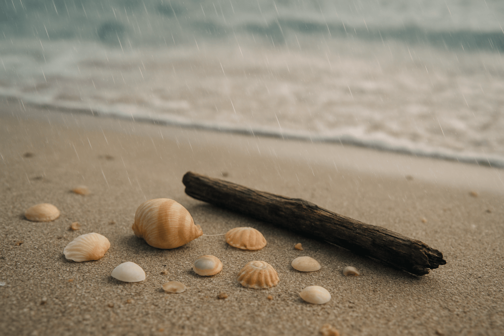 Rain stirs the shallow sands just enough to loosen what the tide has tucked away — little secrets waiting to be found. When the drizzle stops, and the light shifts silver, shell hunters know it’s time to walk.