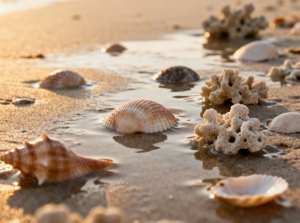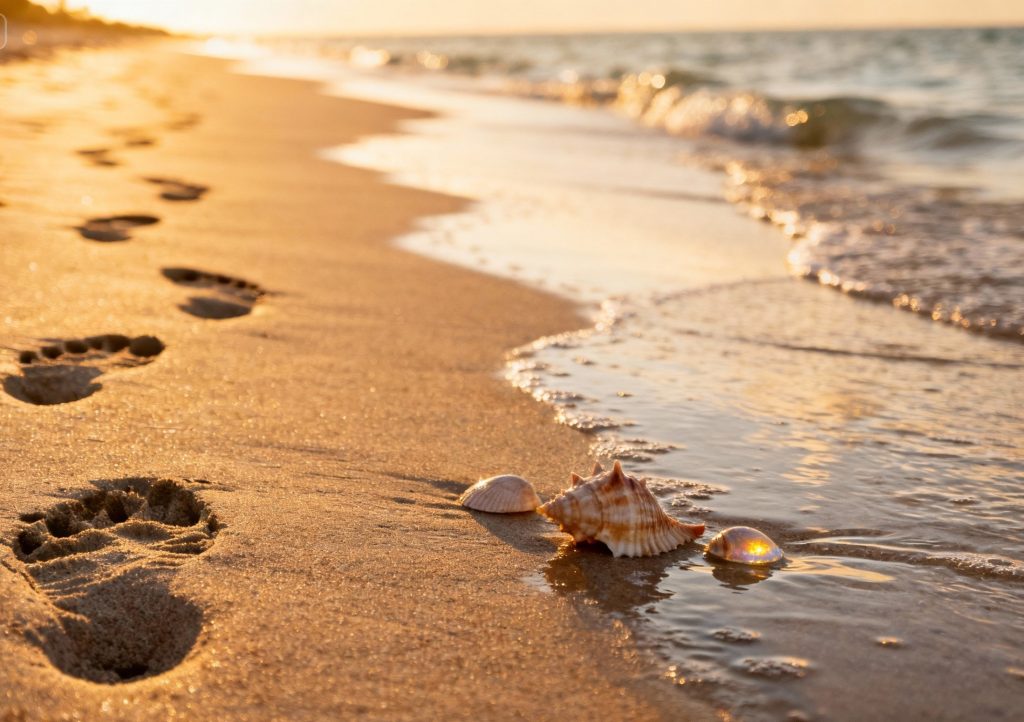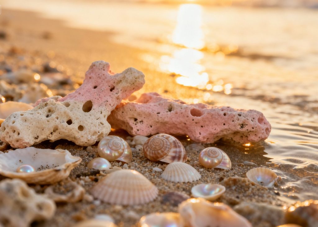 The waves never hurry, yet they create and transform endlessly. Some shells are flawless, others chipped by time—but all shimmer under the golden light as if proud of their scars. This shore is not only a beach; it’s a slow museum of life’s tender endurance.