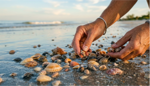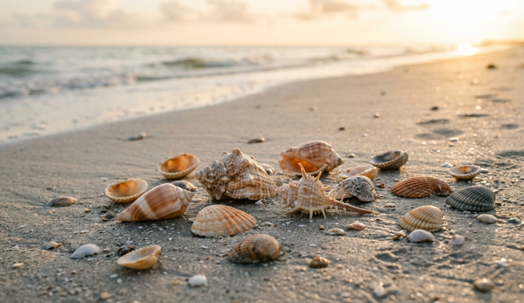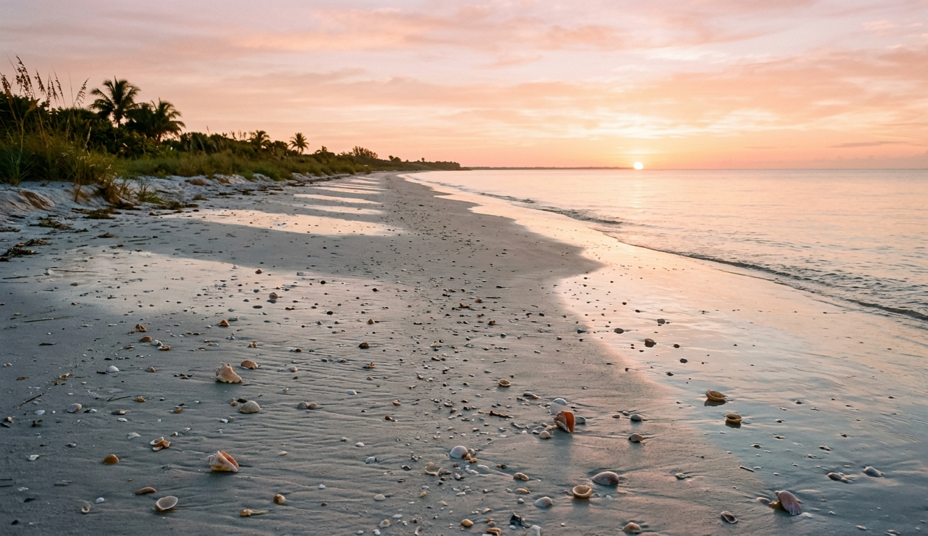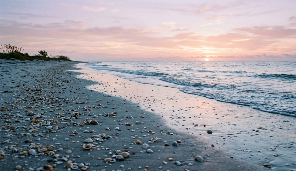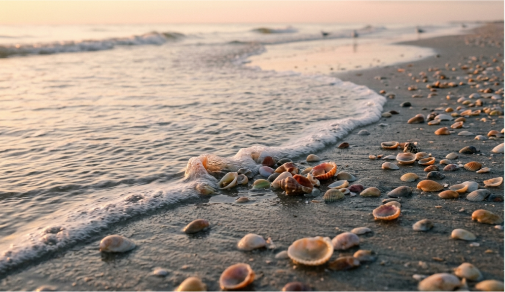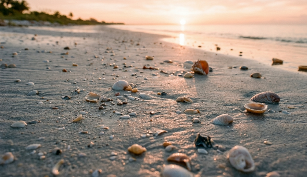 Sanibel’s shoreline runs east–west, which helps collect shells naturally through wave patterns.