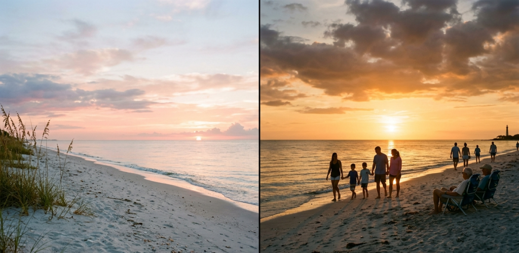 | 🌅 Quiet mornings | Empty beaches, shelling spots |