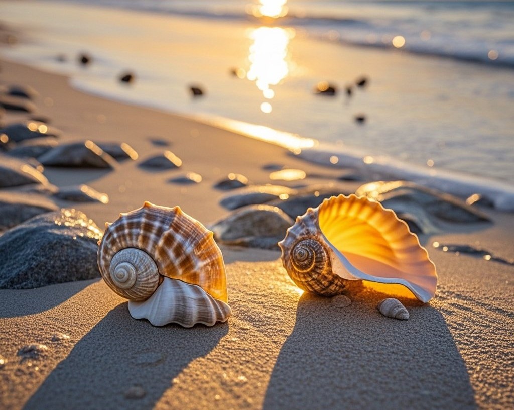 - A shell — suddenly looks like it holds an entire story. Its shadow curves like a wave behind it.