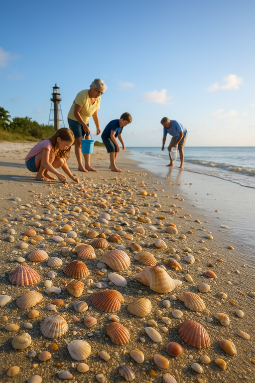 At low tide, the sand here glitters with shells, each like a postcard from the sea. Rare ones—Junonia, Lion’s Paw—sometimes appear, as if the ocean wants to leave a gift right at the lighthouse’s doorstep. Families bend down, laughing, filling buckets with treasures.
