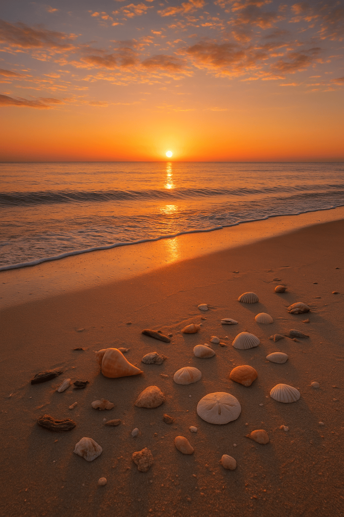 - Still Waters & Soft Light: Early morning air is cool, wind is minimal, and waves are smaller. This means shells remain undisturbed, visible, and glistening under warm light — perfect for spotting subtle colors and shapes.